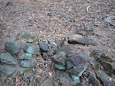 植林帯の中を登って行くと、865m付近に炭焼き窯跡が見られた。この付近からは、あまり高度を稼がない、トラバースするような道が見られる。そして鹿の糞がかなり多く、これらはシカ道だったのかもしれない。最後は大きく西に振る様にその道形を伝う。本渓の源頭部も確認したが、作道されたような跡は見られなかった。主尾根に乗り上げ東に進むと、白い標石が目に入った。