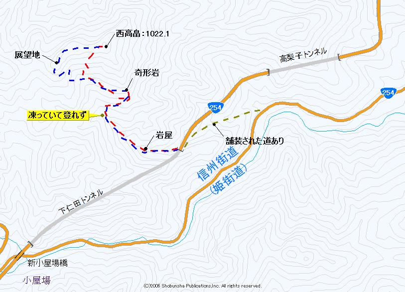三連休の初日、日月と登行後の休養日が十分あると思い負荷のある場所をと思っていたのだが、近所の神社総代より神社境内の伐採を頼まれた。後に回してもいいのだが、結局どこかで作業せねばならないのであり、三連休初日に作業することにした。これがために、短時間で狙える場所として、荒船山北にある西高畠三角点峰を狙ってみることにした。「点の記」からは、国道254号の旧道側からアプローチしているのが読める。当時は新道が存在しなかったのだろう。絵図に見える登路を追うと、途中で新道の場所を跨いでいる。登山道を伝って行ったら、通行できる車道が現れるわけであり、入山点はこの新道の場所とした。