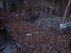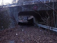| @国道254号の下仁田隧道東側駐車場より。 | 隧道東の下はこのようになっている。旧道からここまで舗装路が上がってきている。 | 谷を跨ぐ小橋。このことから、上に続く道が在った(ある)事が判る。 | 675m付近の右岸に薄い道形が現れる。 |