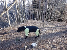 西高畠三角点峰登頂。無傷の奇麗な状態の三等点の標石であった。人工物はこれのみ。地形図にゲジゲジマークがある様に北側は切れ落ちていた。その向こうに神津牧場の施設が見える。展望は木々の間から見る感じ。久しぶりのヤキソバパンを迷犬と分かち合う。山頂の木にはヤドリキが取付いていた。北側の4本ほどは枯死してしまうだろう。往路は、本渓の左岸側で行動してきたので、帰路は右岸側を探ってみることにした。林道終点らしき場所から西に上がっていた道形が気にもなっていた。