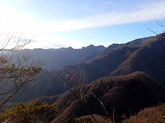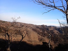 尾根を西に進むと、すぐ西側にも高みがありこちらの方が断然展望が良かった。ここの方が休憩適地と思ったのは言うまでもなく、三角点を訪れたなら、ここまで足を延ばした方がいいと思うほど。さらに西に行くと、かなり瘦せた場所が現れる。幸い根が蔓延るので、それがグリップになっていた。この痩せの西側も展望がいい。先ほどよりさらに良く、ほぼ遮る木がない状況で北側を望むことができる。ここでかなり満足するのだが、さらに西に行くと、1010m付近の肩が、最高の展望地だった。西側から北側、南側にも岩が突き出ており、そこからは南と東側が楽しめる。おそらく地盤が岩で木が生えないのだろう。ゼロではないが、植生が少ないので展望がいいのであった。これで山体の西端まで進んできたことになる。ここから南へ。