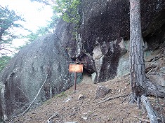 | 最初は石積み護岸の道で続く。 | 最初の道標。鉄製の道標が続く。 | 残り80mといたずら書きされているもの。 | 1250m付近。大岩のある展望地。 |