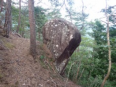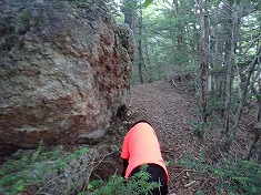 | 1320m付近。道形を倒木が塞ぐ。 | 1330m付近。北アの木挽山にある入道岩の雰囲気。 | A針の山登頂。東西に細長い山頂部。 | A東側の露岩にケルン |