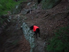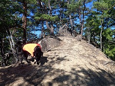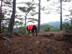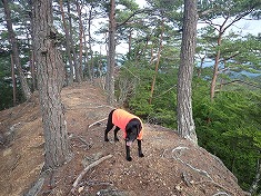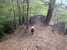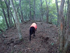 1550mの尾根が分かれる場所は、まんまと北側に引き込まれ進路方角が変わったので西尾根に修正する。林道上の最後は、うまく降りられないかと場所を探ったが、尾根末端では降りられず。北に進んでから林道終点に降りた。獣もそうしているようで、現地にはトラバースするような道が出来ていた。林道に戻り、そして跨ぐように針の山側へと戻って行く。一度歩いた尾根であり、外すような場所もないことが判っているので気が楽だった。そして犬は臭覚が長けている。周回路を歩く時の後半に対し、今回のような往復路の下山時は、あからさまに元気がいい。もう帰りってことが判っているのだろう。