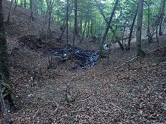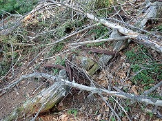 | 1600m付近。シャクナゲ帯 | 1600mの尾根の屈曲点。ここから西へ。東の植生は広葉樹。西は針葉樹。ヒノキも見られた。 | 途中の、林業作業後のワイヤー残置場所。 | D林道終点帰り |