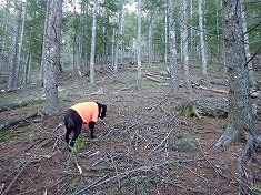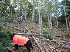 帰路は北尾根を伝ってみる。露岩がかなり点在する尾根で、1620m付近にある大ぶりの露岩西側に、赤ペンキで矢印がされていた。指す方向は山頂側であった。これは林班のものかもしれない。帰路はシャクナゲ帯を分け入ろうとも思ったが、結構密生で跳ね返された。再び下巻いて尾根に戻る。1590mの肩で北進から西進に変わる。ここは東が広葉樹で西が針葉樹、カラマツが多い中で一部ヒノキも見られた。西に降りて行くと造林看板が落ちており、そのさらに西には大量のワイヤーが残置されていた。一帯が伐採された時に支点となった木がワイヤーを巻きつけられながら横たわっていた。
