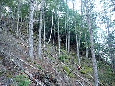 1250mの大岩の基部まで鉄製の標識が続いたが、そこから上は現れなかった。ここから上は、やや大きく西を巻く場所があるので、これまでの細かい九十九折と調子が違うので注意したい。倒木が道形の場所を覆っている斜面もあり、1250m以下と以上では、やや道の状態が変わっていた。倒木の様子からは、もう北杜市でも管理していない場所となったよう。北杜市も広範囲になり、手が回らないのだろう。増富村だったら修繕しただろうと思う。