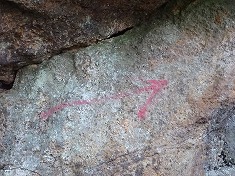 | C西の立木に古い標識が見られた。 | Cヤキソバパンと | 北側にある大岩に赤ペンキで矢印が描かれていた。矢印は山頂側を指している。 | 矢印 |