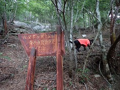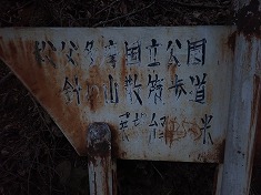 5:03行動開始。鯨岩横の「針の山散策歩道」入口から入山してゆく。歩道から見下ろすと、確かにそこに鯨が居た。石積みで歩道の護岸がされた道を進んでゆく。錆が進んだ標識が見られ、そこに書かれているレタリングに昭和が感じられた。ハッキリとした道形で続き、細かく九十九折を繰り返しながら高度を上げて行く。道に落ち葉が堆積している様子からは、ほとんど歩かれなくなった場所だろうと感じられた。時折見える鉄製の道標が道の場所を示しているのだが、観光目的で歩くのには今の歩道状況はかなり不明瞭だろうと思えた。