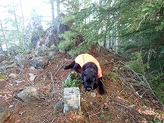 1480m付近から尾根が広がり、ここから歩きやすい場所を拾って進んで行ったら、1525m付近に湧水地があった。水場として使えるほどに流れ出ており水音を響かせていた。ここはまだ樹林帯の中だったが、この上側の1560m付近から一帯が明るくなる。そこは古い伐採地であった。谷地形の延長線辺りを歩いている中で、1610m付近の南の尾根には巨岩が現れる。獣の臭いでもしたのか迷犬がサッとその方向へ動き出し慌てて呼び戻す。基部に岩穴があるように見えた。東進が終わったのが1640m付近で、ここで北尾根に乗り上げる。辺りにはシャクナゲが蔓延り、尾根が伝えずに下側を巻く。もう進む先にピークが見えている。その直下まで伐採痕が残っていた。