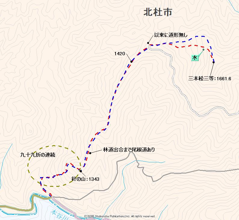 | 途中の1410mピークに大ぶりな岩が見られる。 | 1420高点 | B林道湯川線の終点に出る。上に行くには終点から東へ上る。 | 谷を行くと1535m付近に湧水地あり。 |
