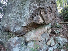 1330m付近には、北アの木挽山山頂に在るような奇岩が見られる。「入道岩」と言っていい形をしており、大きさ的にも木挽山のモノと似ており懐かしさを感じた。もうそろそろ、空がひらけ明るくなってきた。 渓谷の散策歩道としてはちょうどいい距離だろう。等高線の混みようからは、こんな場所に道を切るのは不適と思えるが、作道当時は増富ラジウム温泉街も賑わい観光インフラに余裕があったのだろう。