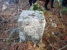 三本松三等点峰登頂、18年前には気が付かなかったが、西側の木に薄く細い標識が縛られていた。おそらくは「三本木」とあったはずである。今は判読できないほどになっていた。標石は、南西角が薄くはく離したように割られていた。迷犬は、かなりへばっていた。ここから魔子側に進んだら苦情が出ただろう。二度目の登頂。再び訪れることはないだろう場所。周囲をよく見て記憶に留める。ヤキソバパンを分かち合ったら下山に入る。