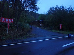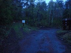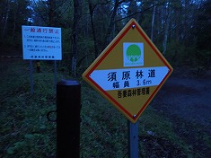 4:40出発。林道入口はチェーンが張られ施錠もされていた。圧迫感のある丸太の積まれた間を進んでゆく。崩れることは無いのだろうけど、ここほど高く積んだ貯木場は初体験だった。木材はカラマツで、そこに「低質材」と貼ってあった。進んでゆくと枝林道が北に分岐してゆく。ここには群馬や新潟でよく見るゲートが設置されていた。ただしロックは外され、手で開けられる状態になっていた。パノラマライン側で施錠してあるので、その奥にあるここは不要ってことなのだろう。「須原林道」と書かれた標識により林道名を知る。ゲート脇はバイクでもすり抜けられるスペースがあった。