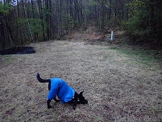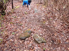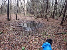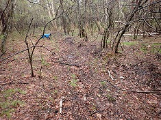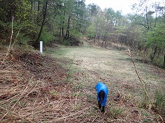 1270mには分岐があり、掘れた道の方を選んで降りて行く1240m付近には十字路があり、直進が掘れた道なのだが、右折して南へ下る道に入る。登ってきた場合は左折になるのだが、直進してゆく道もあり難しい。降りて行くと終点に降り立つ。往路で見た北に登って行く道で降りてきた。さきほど右折して正解だった。ただし、終点の少し東から掘れた道が北に上がっていっていた。たぶん上の分岐を直進すると、この場所に出るようだった。