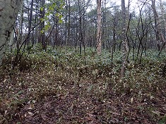 | 1300m付近からササの植生。 | 獣道を伝うも肩丈の笹で、しかも雨なので至極進みにくい。 | 1330m付近でササが終わり灌木の幼木帯となる。 | 1345m付近に見られたフェンス跡。 |