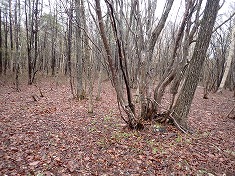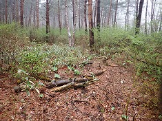 | 帰路は南尾根を避け、南東側に下る。こちらだとササはほぼ避けられた。 | 1320m付近で古い道形に出合う。東西に切られていた。 | 1270m付近の分岐。このような分岐が多い。 | 1240mの分岐。見える右ではなく、左(西)から降りてきた。深く掘れた道形の方。 |