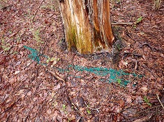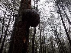 1360m付近には、大きなバレーボール大の「虫よう」のできた木があった。木に何か居るのかと構えたが、コブと判りホッとした。まん丸いもので雨に洗われ輝いていた。ここに至るまでにも見ているが、点々と古い切り株が続いていた。ただし倒木などは一切なく、すべて除去されているのだった。そのための道形もない。切り株やネットが見えたので、道形が現れるかと思ったが、そうはならなかった。