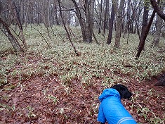 西進から北進に変えると、標高1300m付近から上部で笹が現れた。うまく回避できないかと笹の際を再び西進しだす。しかし全く薄くならなかった。ちょうど獣道のような筋があったので、諦め筋を追いササを分けることにした。見たところ腰丈くらいだったので、それほど負荷にはならないと思ったが、20mほど進むと肩丈になった。雨を纏ったササは重く、雪解け直後で寝ている笹も混ざる。そんな場所は腿上げがきつく、後を追ってくる迷犬はその場所の通過に苦労していた。これがずっと続くのかと半泣きになりそうだったが、それでも道がどこかにあるはずで、それさえ見つけられれば笹の中であっても楽になるはずと思うようにした。