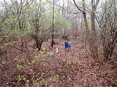 振り返る。林道終点からは北に上がるのが正解。ただし分岐や枝道が多く、「道を伝う」のはけっこう難しい。それより南尾根に乗らないよう注意しながら、北西に進むのでいいと思う。そして笹が出ても巻けるので、避けて登る形でいい。