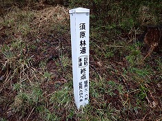 | 1190m付近。広い快適な林道。途中には伐採地は無かった。 | B須原林道終点。終点から先に道形あり。今回はそれを伝うが、終点から北に上がる林道を進んだ方がいい。 | B終点標柱 | 南西側に進むが、道形は消滅。 |