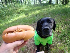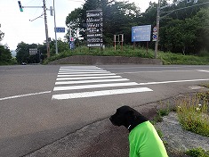 あっさりと高和良比三等点峰登頂。山名標識は無いがトレイルの道標が標石の東側に立てられていた。その標石は予想外にも無傷であった。簡単に登れるこの場所なら、割られている可能性もあると思った場所だが、きれいな無傷の標石が出迎えてくれた。北進してきたトレイルは、このピークから北東に降りて行っていた。迷犬はその方向に降りて行こうとしていた。ヤキソバパンを取り出すと拍子抜けしたような表情で、”ここまでなの”と少し小首を曲げていた。だが、そんなことより食い気で、次の瞬間からヤキソバパンに視線はロックオンしていた。早々に朝食として迷犬と分かち合う。そして帰路に。