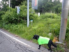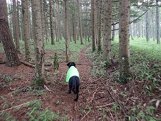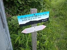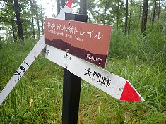 大門峠は変則交差点で、さらに起伏により見通しが良くない。そこを通過車両が高速で通過してゆくので注意が必要。その交差点の北東に、中央分水嶺のトレイル入り口が在るのだが、予想ではもっと明瞭な道かと思ったら、あまり歩かれないのか入口はややモシャモシャしていた。ここにはトレイルの道標と全体図も掲示されていた。雨の後であり、足元を濡らすこの草地が続くのかと危惧したが、10mほど我慢するとその先は一筋の道形が導いており、周囲は低いササの植生だった。食害で笹が低くなったのか、鹿の警戒音が近くからしており、何頭も走り去る様子が目視できた。
