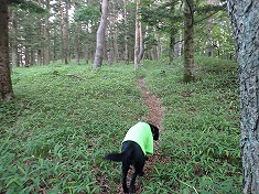 | A道標 | Aトレイル全体図 | 低い笹原の中に道形が続く。 | 根本付近の食害が目立つ。 |