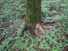 大木としてはシラビソの植生があるが、その根元付近をシカに齧られていた。よく見るのは、立ち位置での首付近の高さを齧っている食害痕だが、ここは根元付近。そこが一番おいしいのだろう。短距離で名残惜しいのだが、とても気持ちいい尾根筋であった。ササが低いので見通しがいいってことがそう感じさせているよう。樹林帯の中で展望は全くないが、不思議なほど気持ちがいい。鹿が多いようなのでダニも気にしたが、付着は皆無であった。高度を下げて行くと、大門峠を通過してゆく車の音が強くなってゆく。