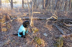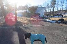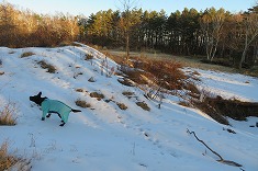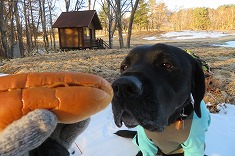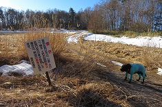 清水原三角点の標石は、雪の無い地面から20mmほど顔を出してくれていた。雪が覆っていたら、探すのにかなり苦労しただろう平らな場所に埋設してあった。無傷の三等点で、国土地理院の木柱は倒れていた。ここはゴルフ場の敷地外のようで、敷地の境には白い杭が打たれ並んでいるのが見られた。西側の開けた場所で、八ヶ岳がよく見える場所だった。快晴無風で、寒さは一切なかった。ここの南西に小屋があり、扉も窓も開け放たれていた。これはゴルフ場の避難小屋だろう。ヤキソバパンで迷犬と朝食とする。かなり探すのに時間を要すと思っていたが、短時間で見つけることができた。