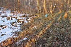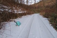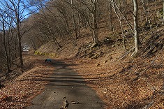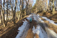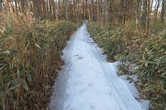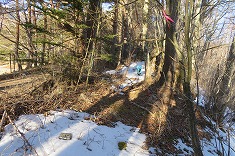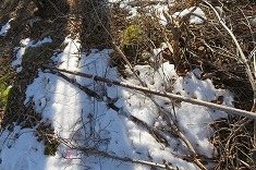 | 日影に雪が残る。凍っている場所も多く、おそらく2駆では登るのは無理だろう場所だった。 | 1320mから林道を離れ谷に | 上に行くと笹が出だす。 | 1360m付近。東からの古い林道幅が見られた。 |