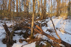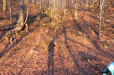 | 谷地形の上部。沢筋は途切れず、樋のような幅で続いていた。 | 拓けた場所に出る。旧のゴルフ場敷地にも見えるが、地形図からの境界はもっと西。 | 新しい轍の見られる林道が走っていた。これは地形図の破線に近い位置にある。 | B清水原三等点 |
