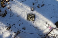 進んでゆくと、北側に「山火事注意」の表示が逆さになった杭が見られる。灯明平点は、そのすぐ東側に埋設してあった。こちらは雪面に天面だけを見せていた。2点は掘らねば出てこないと思っていたが、容易に見つけることができた。こちらにはダンダラ棒がバン線が巻かれて横たわっていた。そしてピンクのリボンが場所を示すように結ばれていた。ここ灯明平の名前から、麓の「灯明の湯」が名付けられたよう。お湯を利用しながら、なぜに灯明なのだろうと不思議だったが、ここの地名を知って合点がいった。予定した2点を拝めたので、帰路に。
