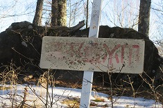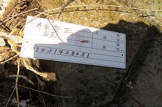 | さらに林道を西進 | C山火事注意の表示が逆さまになっている。この東に埋設してある。 | C灯明平四等点。リボンが下がる | Cこちらも無傷。幸い、雪から顔を出してくれていた。 |