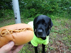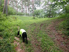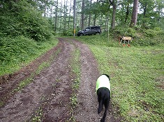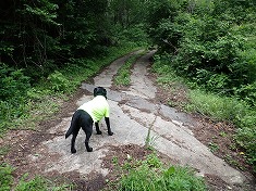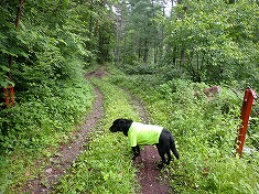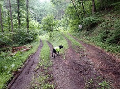 周囲展望は無いが、南西の千曲川のある方角は、木々の間から明るさが強く得られていた。雨でなかったら八ヶ岳が望めるのかもしれない。かなり早いが目的地到達であり、迷犬とヤキソバパンを分かち合う。さて下山。帰路は1220m地点からの破線路を伝おうとも思い、カーブの場所から覗き込んだが、道形は皆無で野草が覆っていたので諦める。その背景には「入山禁止」の文言がある。林道以外の場所であり、咎められる可能性があるからだった。