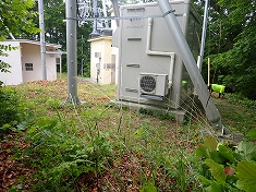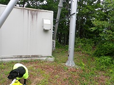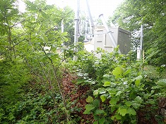 登って行くと山主の注意掲示があり、違反者には30万請求するとあった。スタート地点のきのこの山主は10万だった。おそらく向こうは松茸ではなく他のキノコ。ここは松茸が採れる場所なのだろう。最後の九十九折を登って行くと、向かう先に大ぶりな建物が見えてくる。斜面に造られ、基礎が地下室のようになっており、上に蓄電設備が置かれていた。ここを右に見てカーブしてゆくと山頂だった。