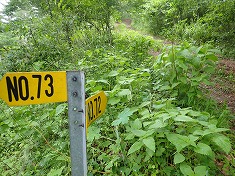 1125m付近からダート林道がコンクリート舗装に変わる。少し小雨が当たる様になってきたが、雨具を着るほどではなかった。登って行くと峠となり、四差路となっていた。「南牧無線中継所」の看板があり、何か解説がされているようだが全て退色していた。その南牧村側へ降りて行く道にはゲートが造られているのだが、ロックはされておらず開いていた。不思議なのは、峠から下に向けて入山禁止と出ていた。普通は麓側から上に向けてのものを見るが、ここは上からだった。町村界の場所であり、南牧村側の小海町側からの侵入者に対する自己防衛であった。東へは1265高点峰に向かう道があり、そこを背に西に進む道に入る。分岐には巡視路道標が立ち、向かう先は72番であった。