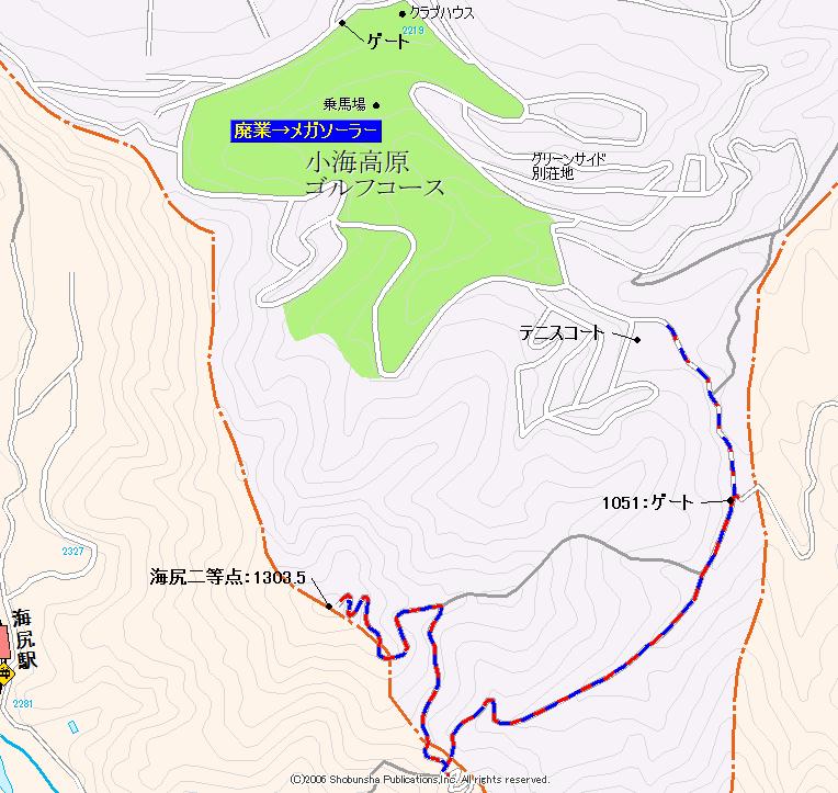 この小海原地区の南、山体としての北麓の道が不思議でならなかった。ダート道を入って行くと答えが出ていた。「小海グリーンサイド別荘地」と看板が出ていた。それで納得で、道の切り方は別荘地のそれであった。ただ、その間に見えるソーラーパネルの土地は何なのだろう。これも後から判るが、以前に別荘地の中に9ホールのゴルフ場が在ったのだった。ポツンポツンと別荘が見えるが、ほぼ廃墟のようで過去の場所と思い進んでゆく。その途中に、分岐に番地まで書かれた表札がある場所があり、右に見ながら進んでゆくと分岐からの右の道の先にあるお宅から明かりが見えマイカーも置かれていた。まだここで暮らしている人が居ることが判った。その先で道は北に向く。その手前を東に折れると、地形図の二重線路は終わり実線路となる。