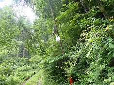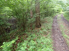 5:52行動開始。南に進みながら東を見ると、緑のフェンスに囲われた畑が見える。現在進行形で管理されている様子があった。歩き出して5分ほどで、1051高点の分岐となる。東へ分かれて行く側の道には、路肩に大型獣用の檻が置かれていた。分岐から南進する道には可倒式のゲートが造られ、この時は上がっていた。その横に「松茸山につき入山禁止」と掲示してあった。林道利用も該当するのか、この時は道から山中に入ることを禁じていると解釈し南に登って行く。ここからの登りは、すぐ東に細い流れがあり、流れの音もする目にも耳にも心地いい場所だった。