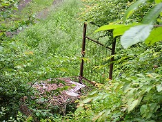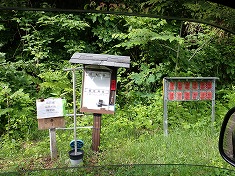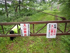 峠まで戻り、北に降りて行く。沢沿いになると、やはり心地いい。雨の後であり、いつもはもっと細い流れなのかもしれない。1051高点を通過するときに、高く上がったバーに取り付けられた掲示を見上げる、関係者以外入山禁止とあり、もう一つ役場の電話番号が書かれたものが下がっていた。この日は開いていたが、閉まっている時もあるようだった。