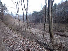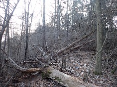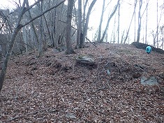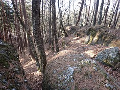 | 林道は状態がよく、ゲートもない。950m付近から尾根に。 | 960m付近。やや長い距離、倒木帯がある。 | 995m付近。古い道形あり。 | 1000m付近。城址のような棚がある。 |