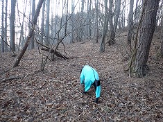 一本松点からは尾根を北に進んでみる。東斜面も直下で藪化していたが、そこより密度が濃い感じで藪尾根だった。低木で見通しが良く、一見歩きやすそうにも見えるのだが、ここにも棘のある木が潜んでいる。しばらく北に進んだが、なかなか樹勢が弱まらず北東の植樹帯に逃げて林道に降り立つ。針葉樹記号は書かれていないが、ここは広葉樹の場所ではなく針葉樹の中を往復した方が歩きやすい。下草はほとんどない場所であった。