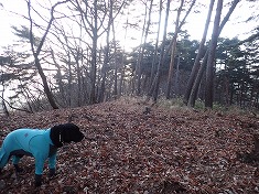 940m付近で林道に降り立つ。南を見下ろすと、すぐ下に北沢の流れがあった。流れと言うより凍った場所が多く見られた。肬水点へは、東側のカーブの場所から取付く。尾根上は痩せており、北側下はゲジゲジマークの場所なので緊張感が伴う。わずかに登り上げると迷犬が三角点の場所で待っていてくれた。