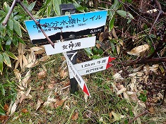 7:35サッカー場北側の駐車場を出発する。駐車場とサッカー場の間に林道幅の道がある。そこに中央分水嶺トレイルの道標が立ち、ここを「女神湖」と名付けられていた。このサッカー場の場所には、以前は長野県警の保養施設が在ったとのこと。点の記でこのことを知った。林道幅の最初はチェーンゲートがあり、越えて進むとサッカー場の北端となり、ここにも中央分水嶺トレイルの道標が立ち北北東に進む道を案内している。この場所から西に細い道形が分かれている。最初はやや笹に覆われているが、サッカー場のフェンス沿いになると、かなり明瞭になる。