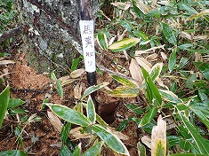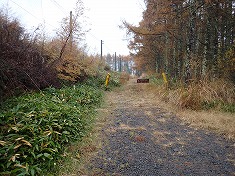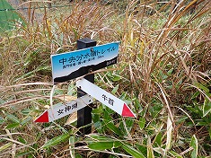 | サッカー場北端の道標 | サッカー場北端からの道形。 | 進む途中に「馬糞取り」と書かれたスコップがある。 | 歩道の途中で笹原に突っ込む。地形の最高所へ向かってゆくと、ササの切れた草地がある。 |
