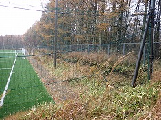 | @サッカー場北東の駐車場から | @中央分水嶺トレイルの道標あり。「女神湖」ポイント。 | @進む側にチェーンゲート | サッカー場の北端で、フェンスを巻き込むように進んで行く。 |