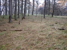 葭ヶ沢三等点発見。二本の枯れ枝の下になっていた。地表に顔を出しているものの、笹に隠れてしまっているので近くに行かないと見えてこないのだった。しっかりと防障石も置かれ、無傷の三等点だった。この標石以外の人工物は皆無。カラマツ樹林の中で展望は無い。各方角の景色が同じなので、帰路の進路を迷いやすい場所であった。帰りは、往路より北寄りで進んでみた。北側の方が笹の植生が無い場所が広かった。それでもササ漕ぎは避けられないので分けて戻る。サッカー場の西端からは、古い道形跡が南東に進んでいる。舗装車道側からこの道を見ているが、現在は完全に笹に覆われてしまっていた。ちなみに、現存する道形を南に進むと新宿区立の施設前に出る。そして大門峠側へと進んでいる。