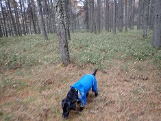 コーヒーを飲み干したタイミングで勢いをつけ外に出る。ハッチを開けて準備をするのだが、横殴りの冷たい雨にどんどん濡れてゆく。雨具を着こむものの、最初こそ弾いたが、すぐに浸透してゆく。私の場合は、藪漕ぎで生地が擦れてしまっているので、防水処理をしても買った時のような撥水状態にはならないようだった。迷犬には、ラッシュガードを着せた上にさらに雨具を着させた。笹漕ぎがあるので、ダニ対策と雨対策であった。