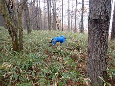再び馬糞取りを見て進み分水嶺トレイルの曲がり角に出る。林道幅を南東に進み駐車場に戻る。ここにはもう一つ、この道と並行にオフセットした位置に道形跡が存在していた。先ほどのサッカー場西側の道同様に笹に覆われてしまっていた。迷犬はあまりにも短く消化不良だったのか、雨と風から逃げたかったのか、リアハッチを開けるとそそくさと乗り込んでいた。