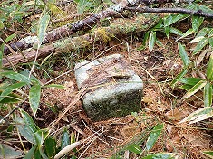 | 通過してきた場所を振り返る。 | A葭ヶ沢三等点の場所は山頂部であるが広い地形で、標石がすぐには見えてこない。 | A枯れ枝の下になっていた。 | A無傷の三等点 |